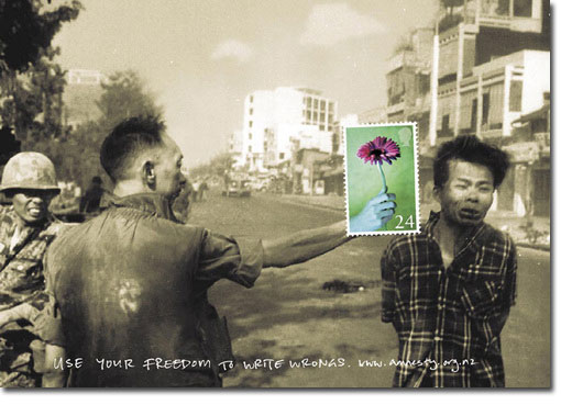 これはネットで拾ったAmnesty Internationalの広告です。ちなみに基になったオリジナルは、Eddie Adamsが撮影してピューリッツァー賞を受賞した有名な写真で、胸糞が悪くなる嫌な写真です。