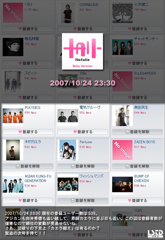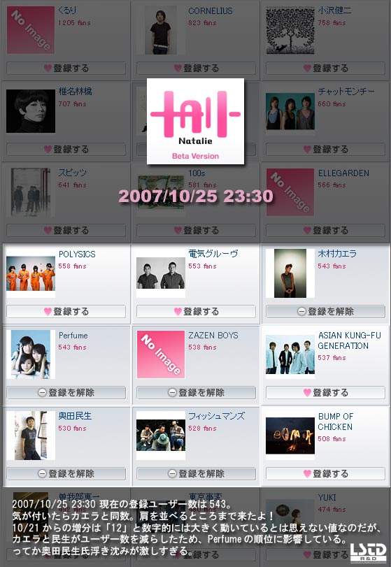 おそらく、ナタリーにユーザー登録をしてまで邦楽の情報を積極的に仕入れたいと思っている層は、既にポリリズムがリリースされた9月の段階でPerfumeはチェック済みであり、その時気になった人たちは既にマイアーティストに登録していたのだろうね。