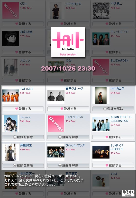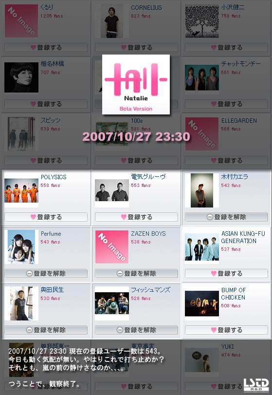 結果として、10/21 22:50時点での登録者数は「531」。本日10/27 23:00時点では「543」。今週1週間で増えたユーザは12人。この数字どう見ましょう? ゴールデンの歌番組という今までに無い程の露出だったにも関らず、意外と少ないなと感じた。50人くらいは行くだろうと(*1)予想していたんだけど全く外れた。